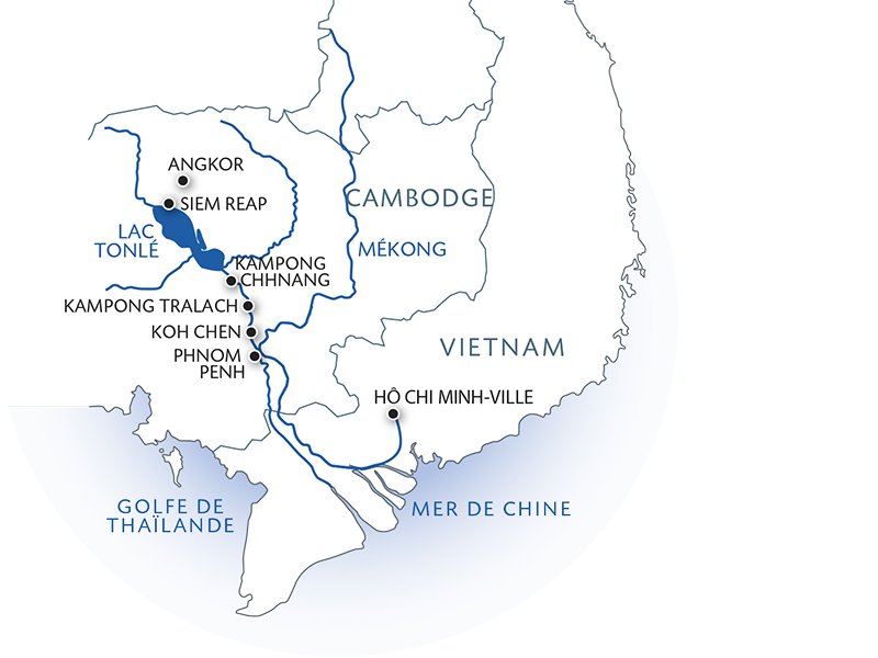 Des hauteurs de l'Himalaya aux côtes sud de la Mer de Chine, au terme d'un parcours de 4500 km, le Mékong, partout où il coule, fascine les hommes et façonne leur vie. Nous vous proposons de descendre ce grand et généreux “serpent d'eau”, depuis les vestiges d'Angkor jusqu’à la rivièreSpaceTonlé sur les pas d’Henri Mouhot, puis Phnom Penh et Hô Chi Minh-Ville, ville encore fortement imprégnée de la présence française coloniale. Voyage propice à la méditation qui vous permettra de vivre au rythme du Mékong et de ses affluents à bord d'un bateau alliant confort et charme colonial.